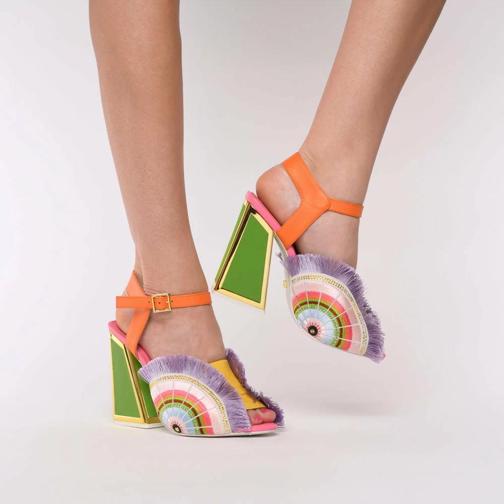 Reimagined for SS’22 our iconic Ariel style feels bolder and more expressive than ever. This heel crafted from leather in bright, mixed hues features an embroidered fan-style detail to the sides, with our signature framed heel. They’re ready when you are.