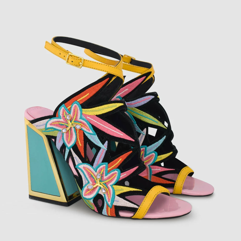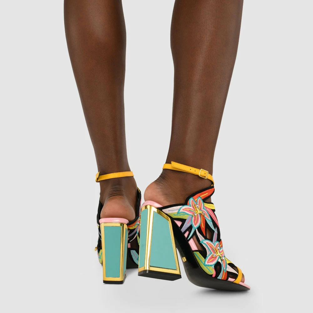 It’s paradise found with the Calypso design. Crafted from mermaid green full-grain Nappa leather, this kicker heel features a bird of paradise detailing in bright hues. Suitcase, you ready?
