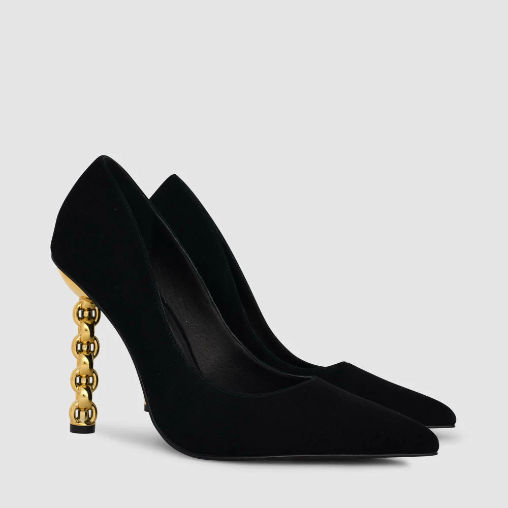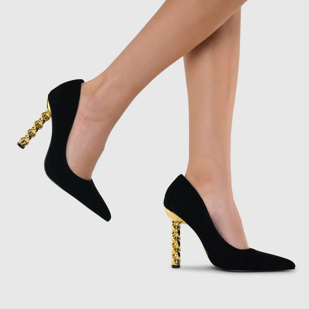 Meet Lydia, an even sexier take on our now-iconic chain heels. Crafted from black suede leather this style is a stiletto pump with a gold-toned chain heel that puts all the drama behind you.