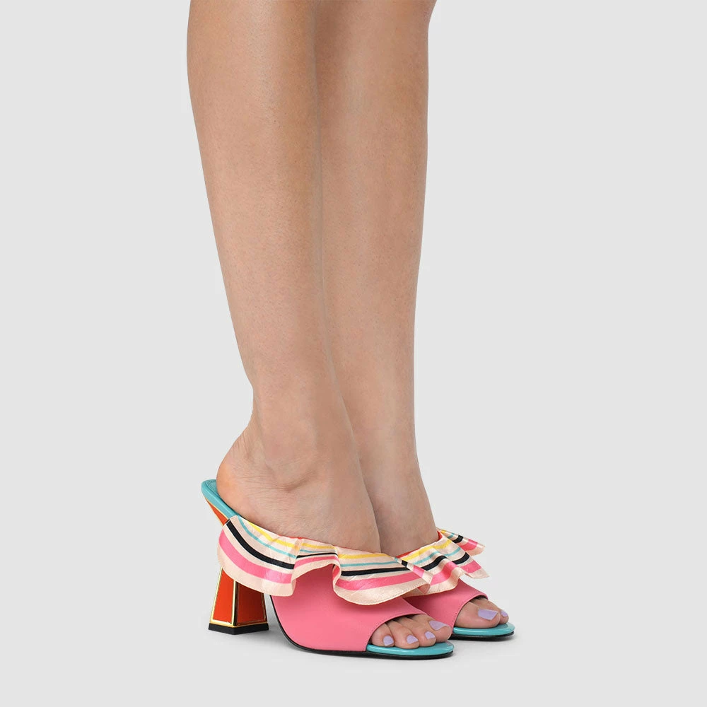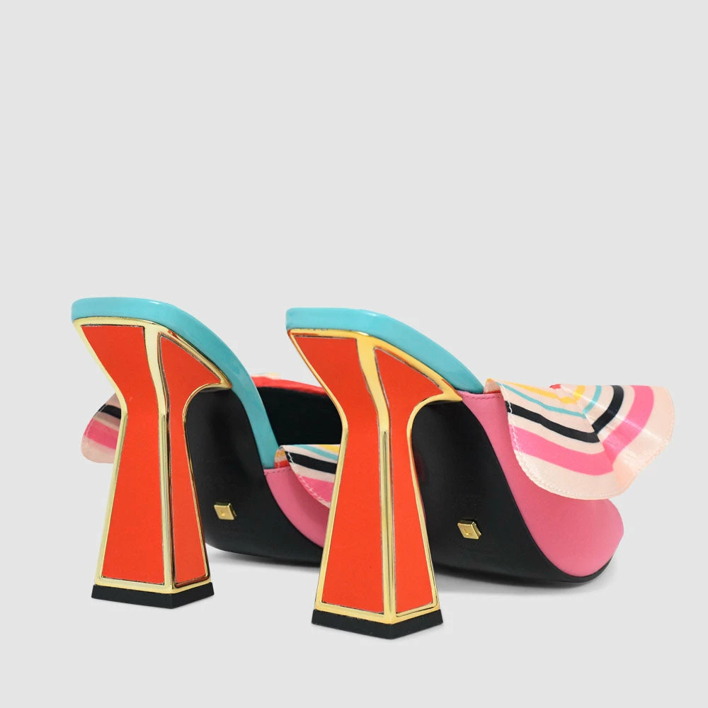 A new style for PF’22, the Desiree blooms just like you. Crafted from a dragonfruit pink leather with an electric blue sole, it features a furled stripe detail to the upper that feels oh-so-chic. Finished with a hourglass heel, this mule is vacation ready.