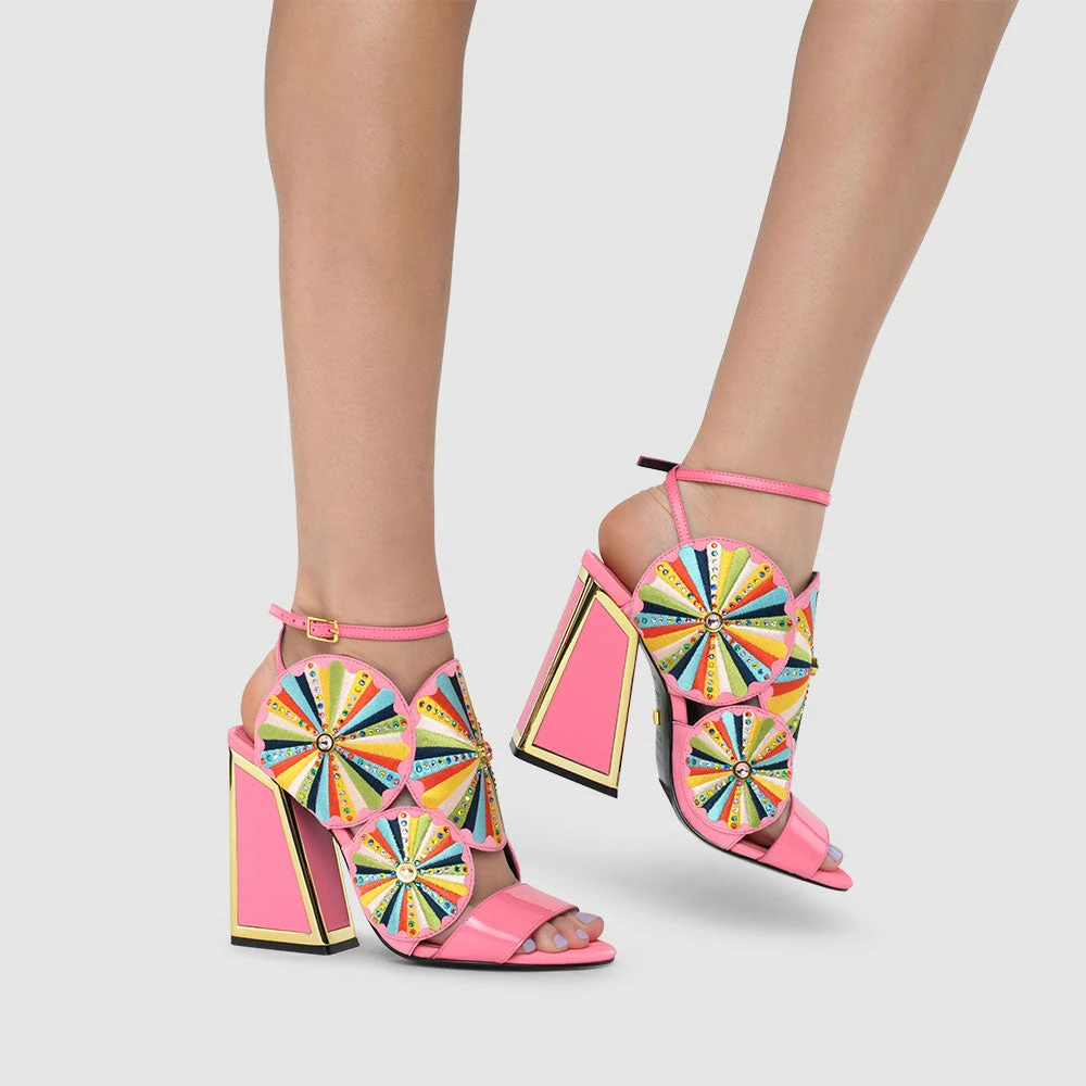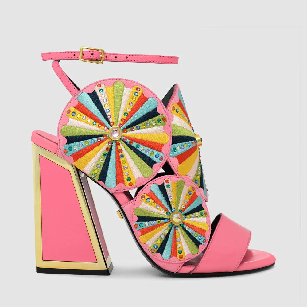 Bright, bold and beautiful—the Frida matches your energy. This high heel style is crafted from dragonfruit pink and multi-coloured leather, with circular detailing studded with crystals. Set on our signature frame, this is a Kat Maconie icon that makes you feel iconic.