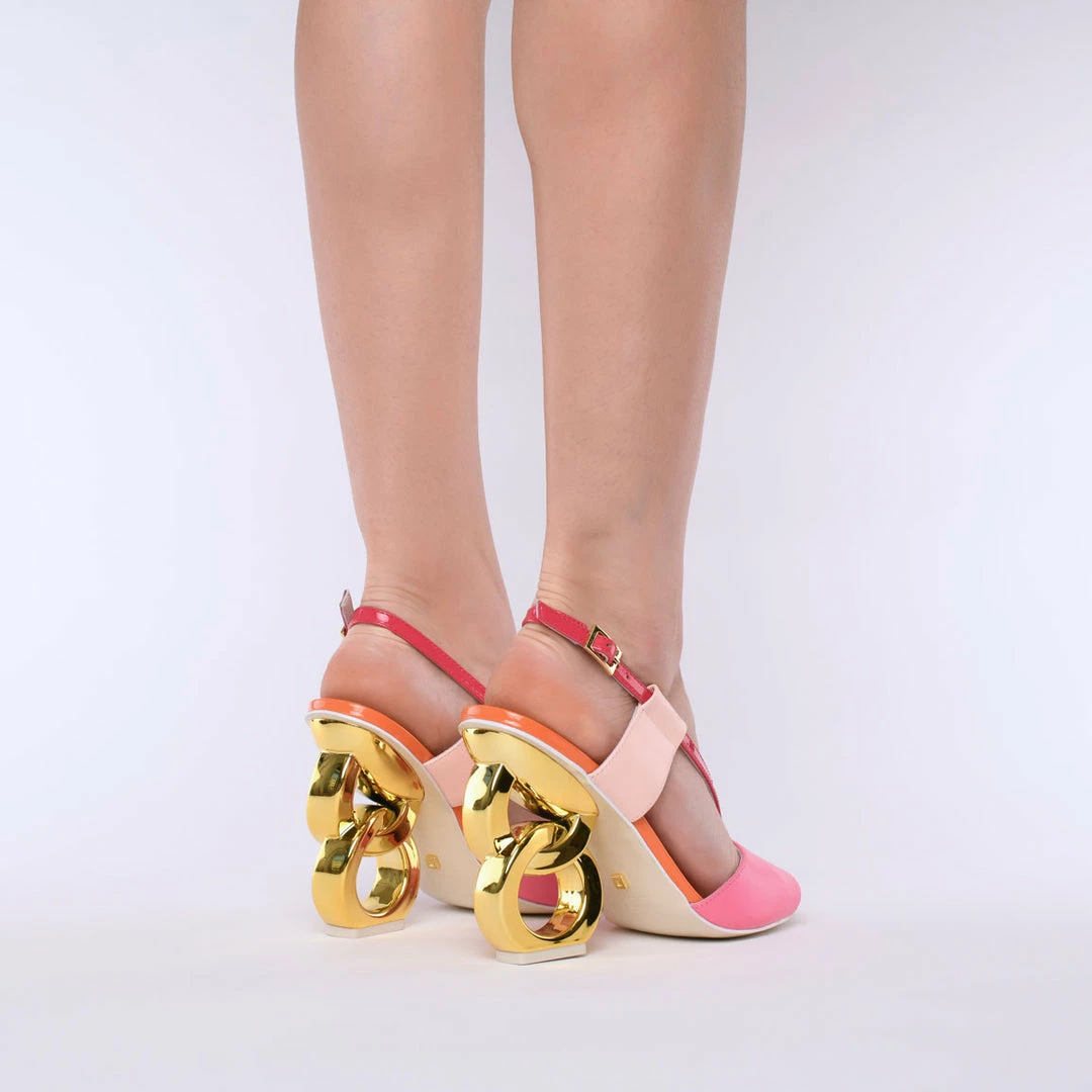 You can’t be named Halle without being iconic. This strappy heeled sandal is crafted from watermelon pink and satsuma-orange leather, featuring our signature double-chain heel for added edge.