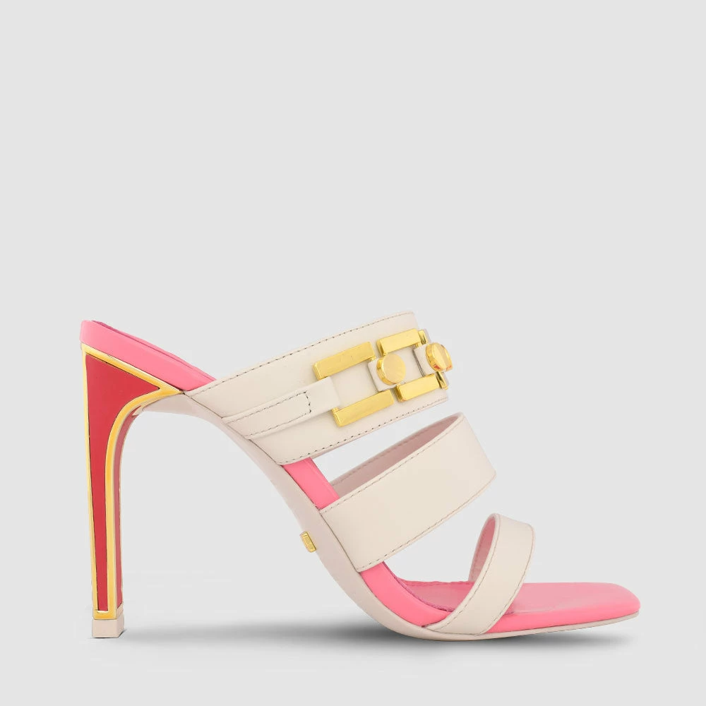 Sit back and relax, in these open-backed heels that are made for vacationing. The Georgie is a mule heel, with a white leather upper and chain detailing that lends a little something something.