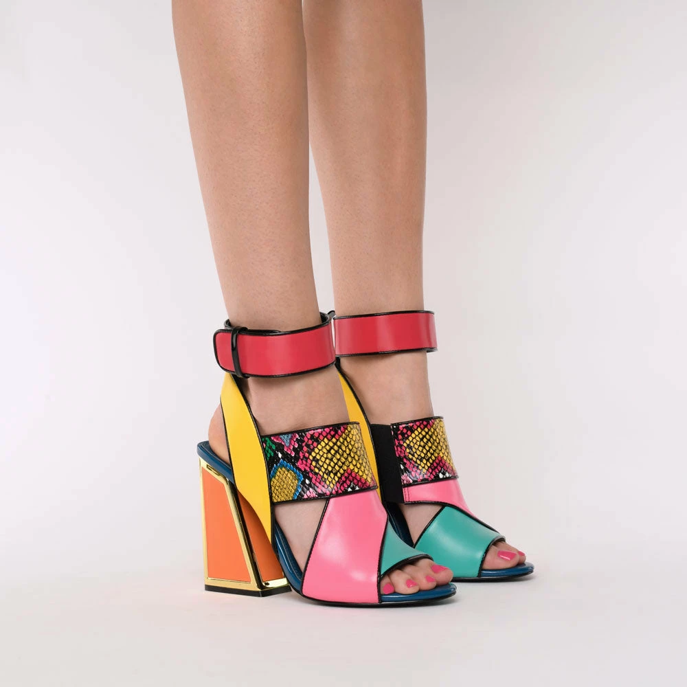 A chunky statement shoe for all your well-earned plans. The Wendy is crafted from multi-coloured bright leather and with a snake-print effect, wide straps and a buckle to the ankle – made for strapping in.