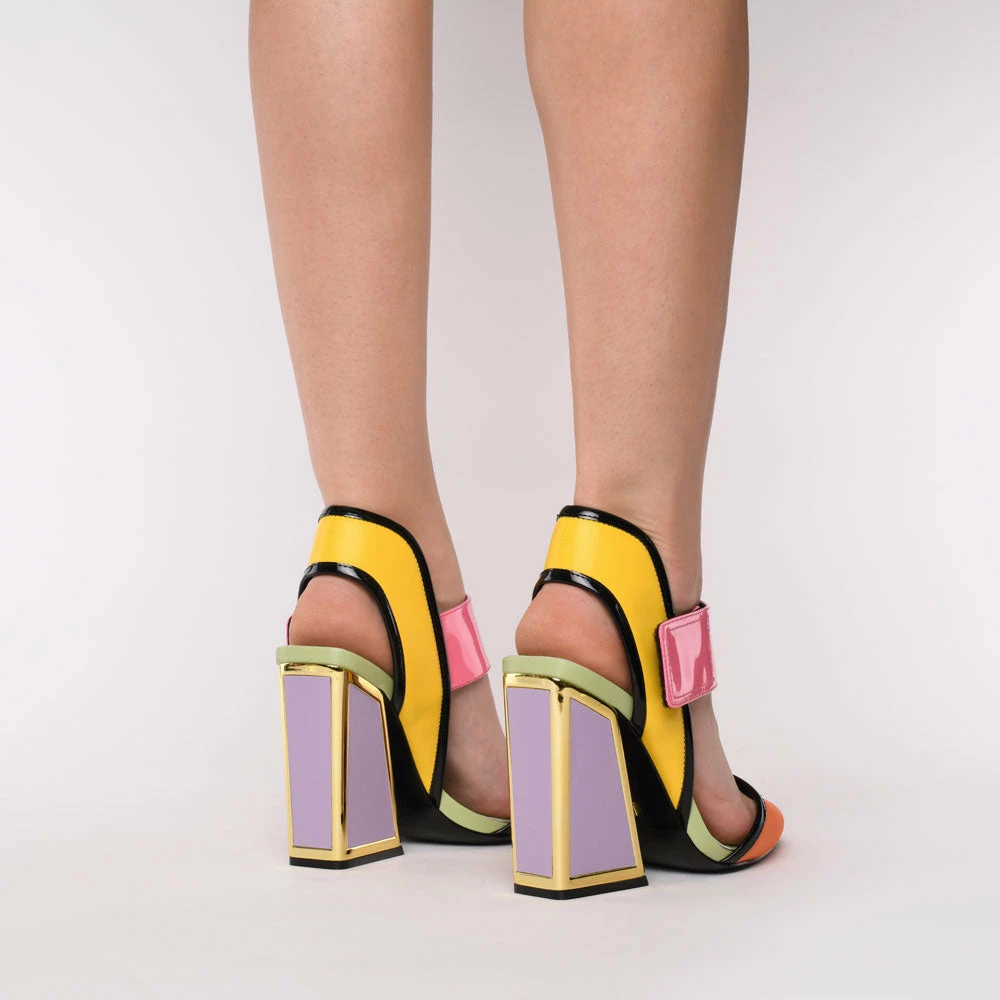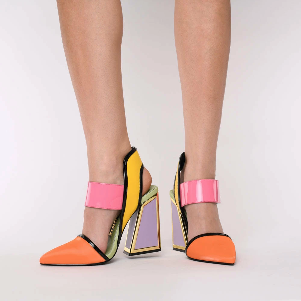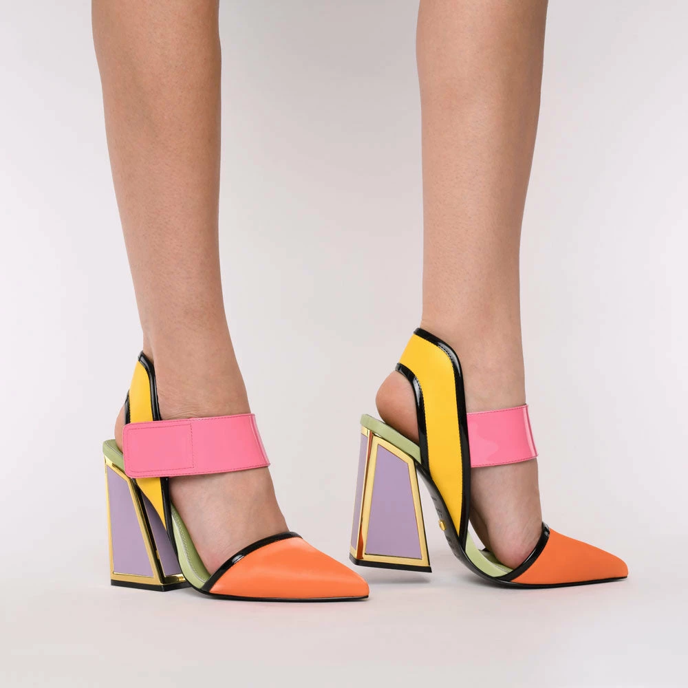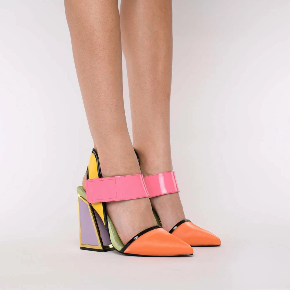 Dull is out and the Izzy is in. Feel polished in these pointed-toe courts but stand out with pink, yellow and orange hues and a chunky velcro strap. Shoes that take you from meetings to cocktails, with the signature Kat Maconie heel, these are not the kind to keep stored under your desk at work.