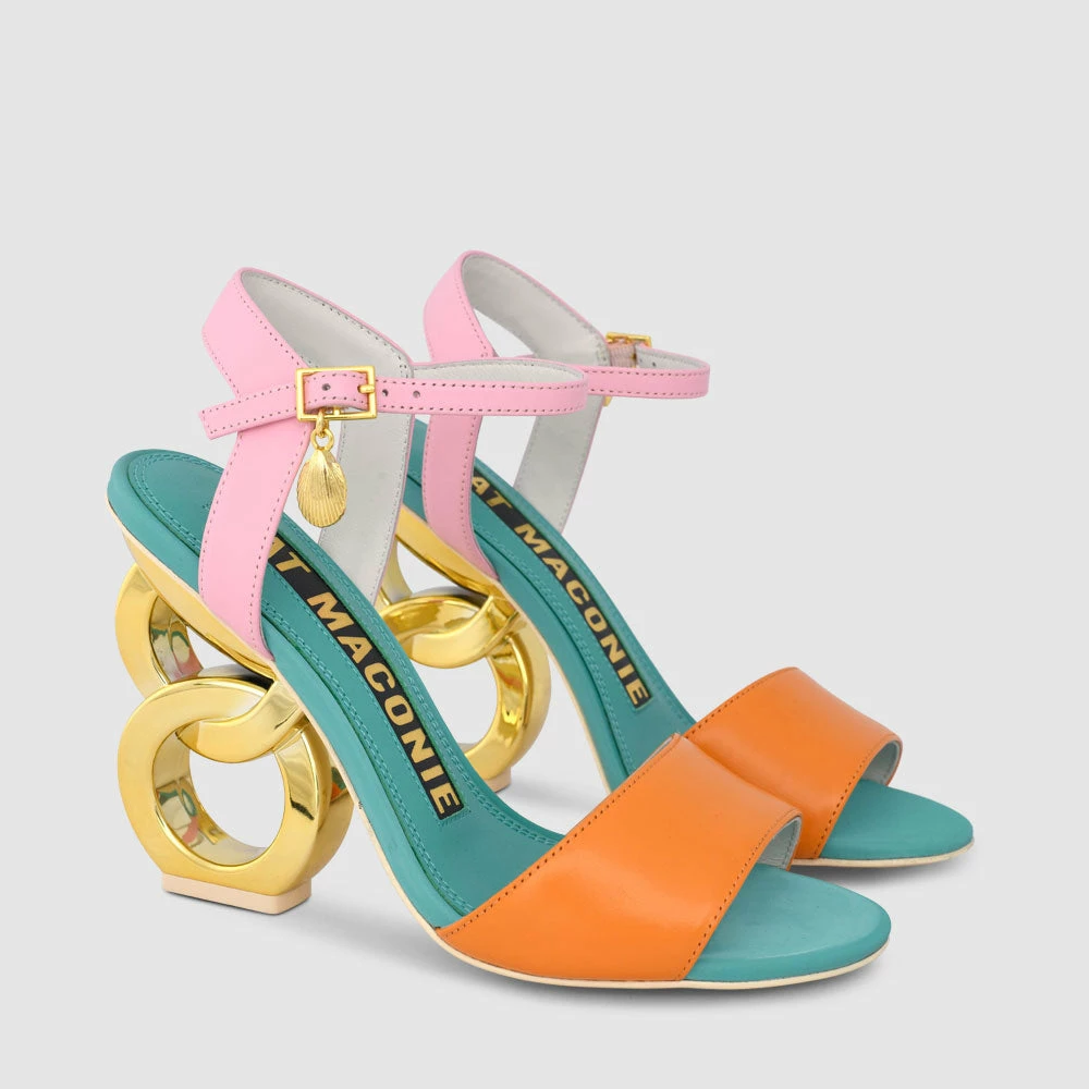 Stack up your feel-good factor with the Jade design. Set on our signature double chain heel, this style is crafted from mermaid green and orange leather, complete with shell charm on the ankle strap for a little hint of beachy charm.