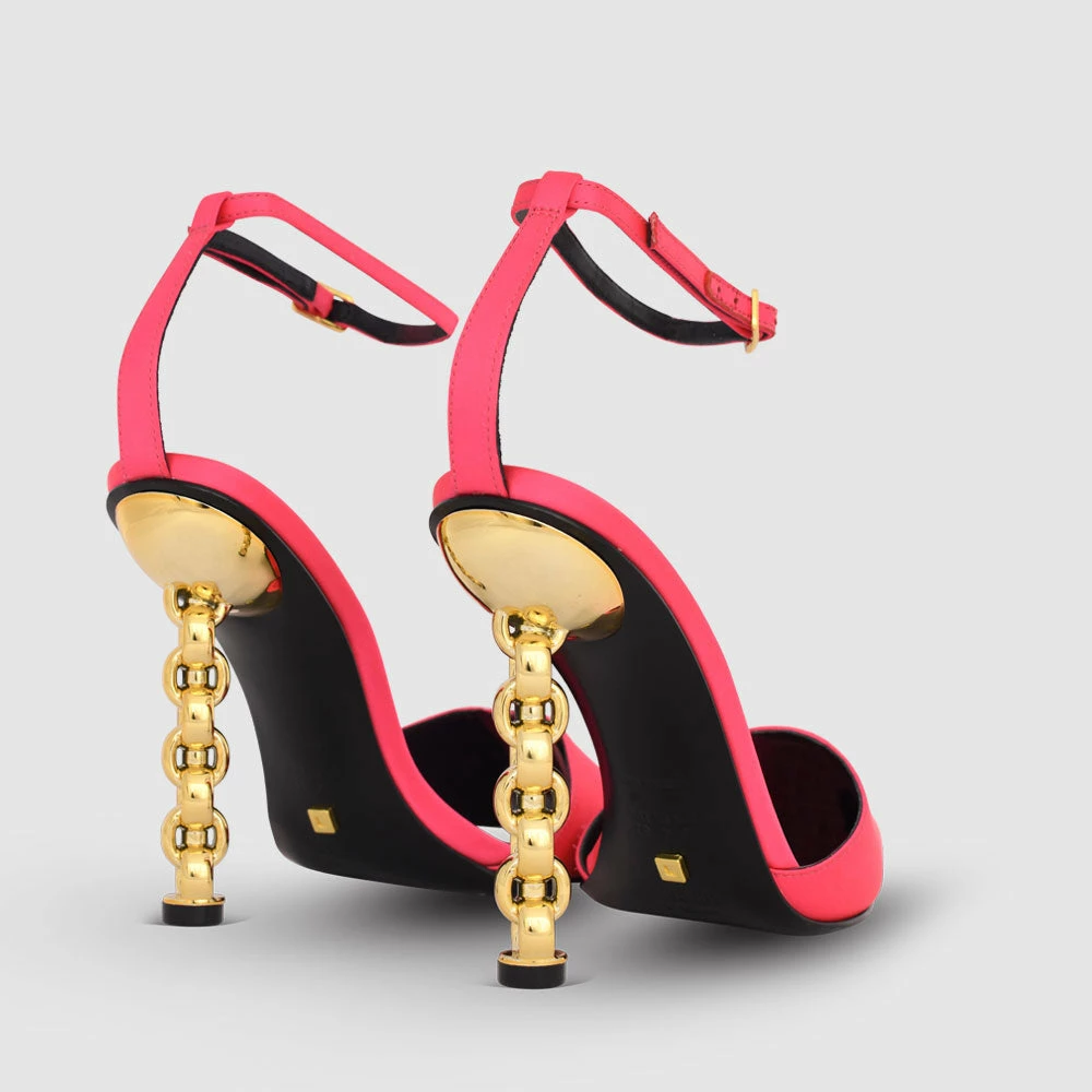Meet Jojo, an even sexier take on our now-iconic chain heels. Crafted from dark highlighter pink leather this style is a stiletto pump with a gold-toned chain heel that puts all the drama behind you.