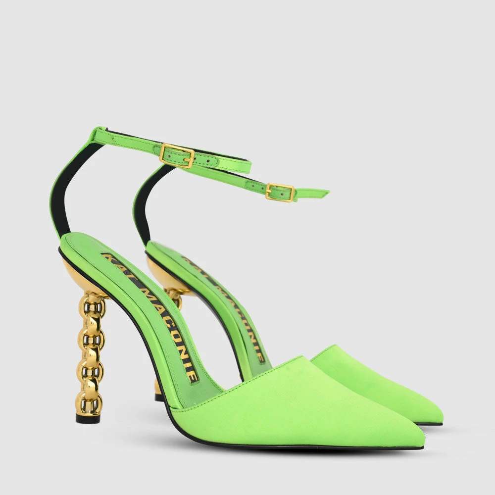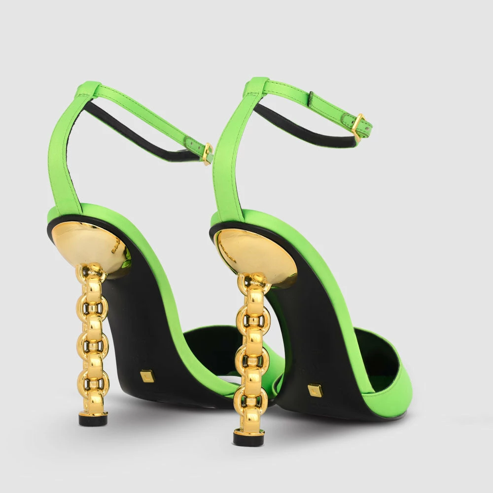 Meet Jojo, an even sexier take on our now-iconic chain heels. Crafted from dark highlighter green leather this style is a stiletto pump with a gold-toned chain heel that puts all the drama behind you.