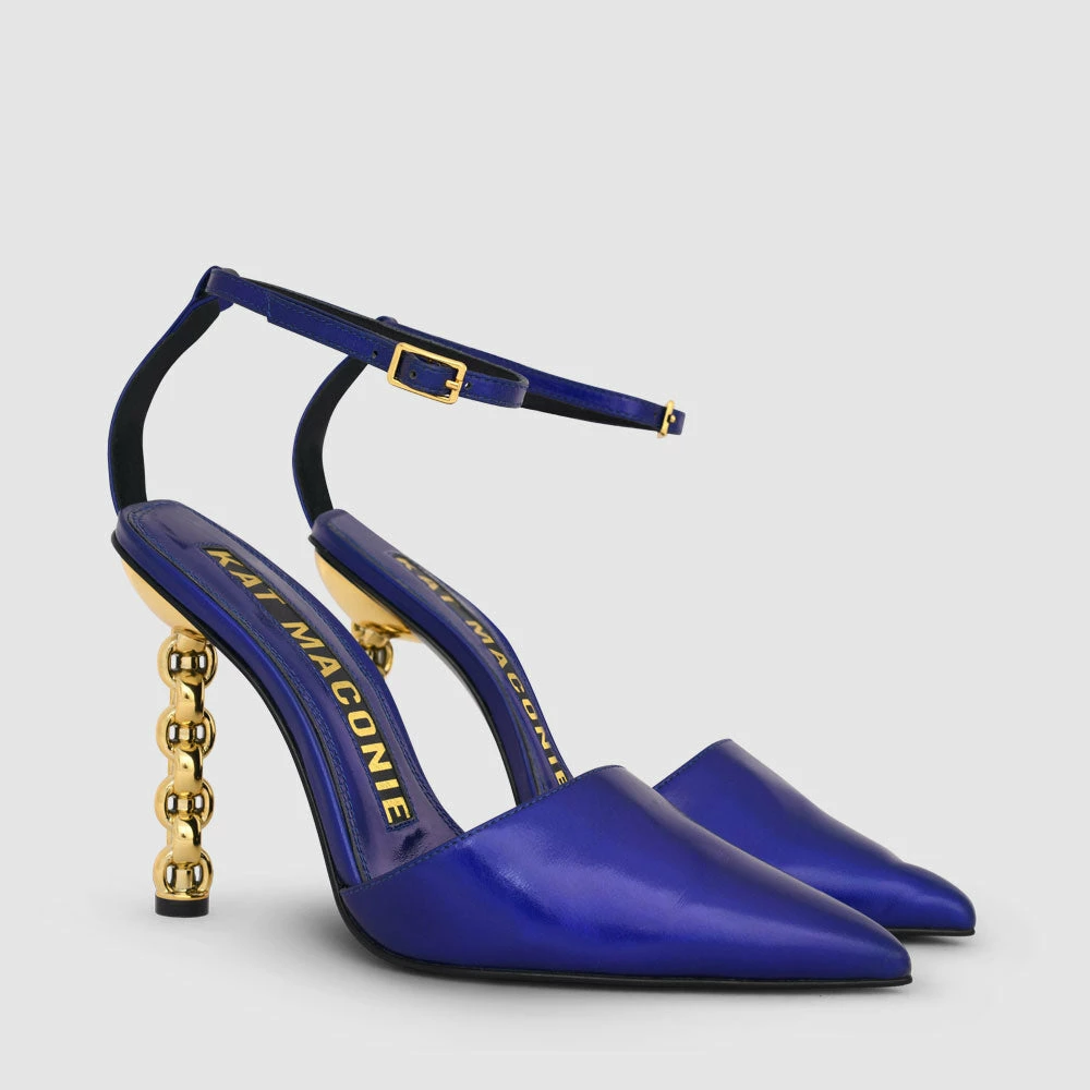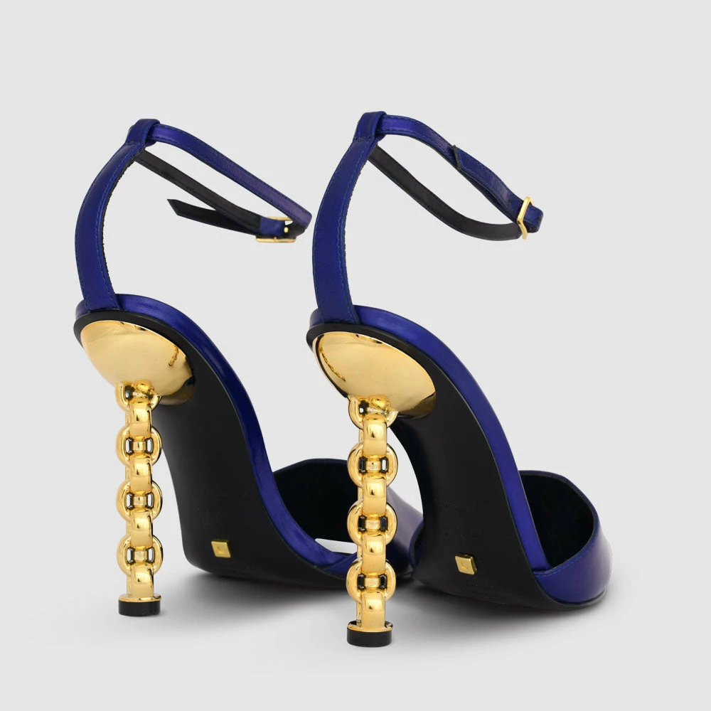 Meet Jojo, an even sexier take on our now-iconic chain heels. Crafted from dark night-shadow blue leather this style is a stiletto pump with a gold-toned chain heel that puts all the drama behind you.