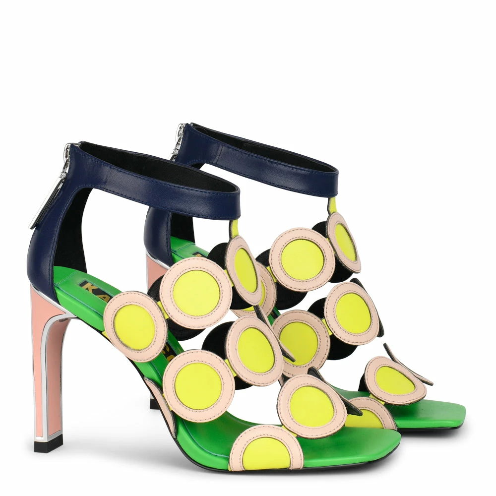 A retro-inspired heel to see you through summer, the Kayla patent style is open-toed to flaunt that pedi. Pastel pink and yellow circular detailing and a flat-back stiletto heel combine for a playful take on your new going out-out shoes.