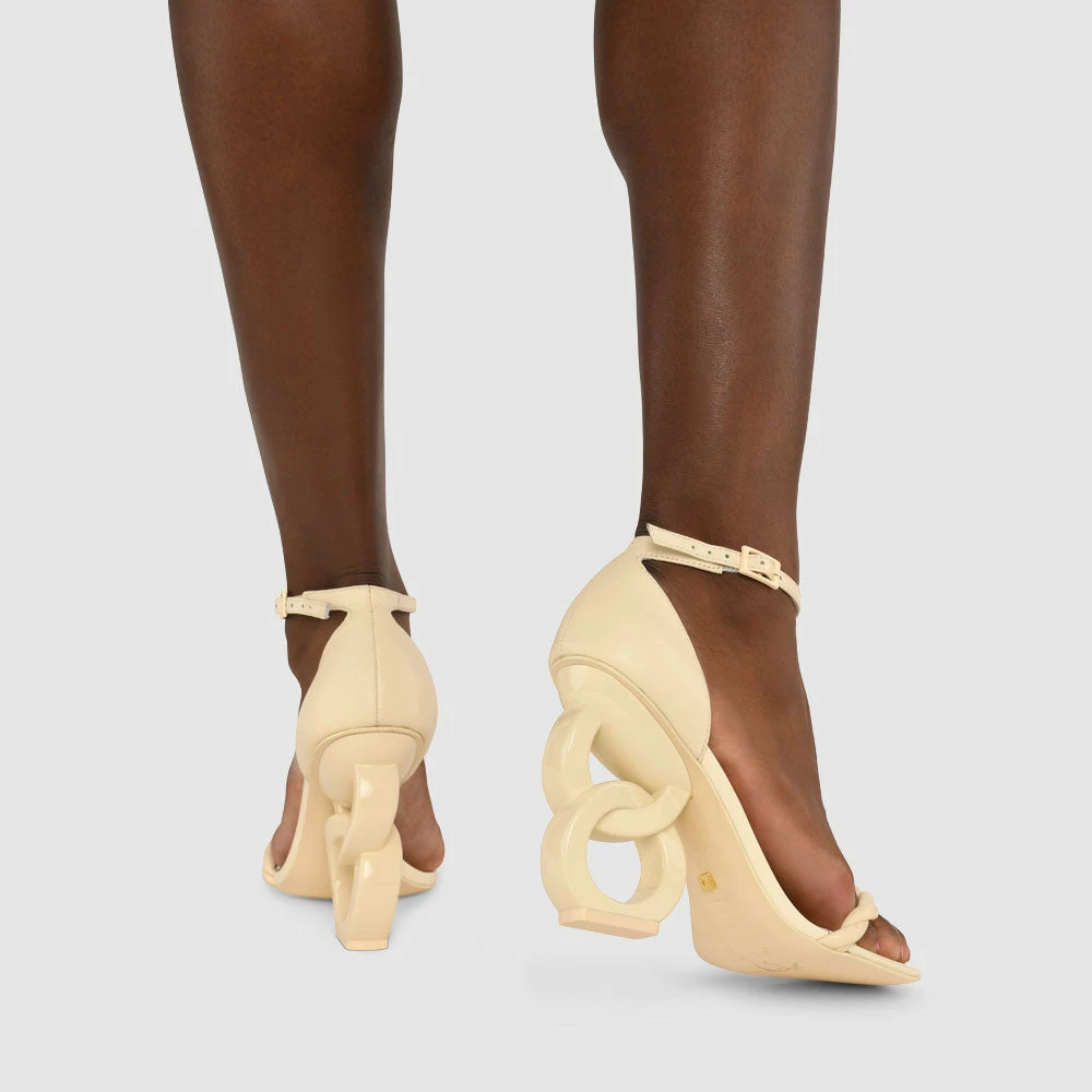 The Melanie = big mood. With cloud-inspired padded straps and our signature double-chain heel, this all-white leather high heeled sandal combines comfort with evening style.