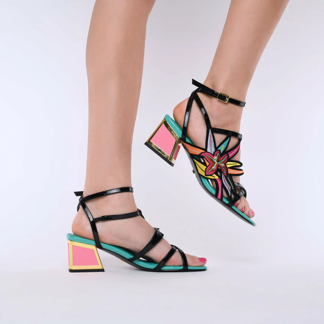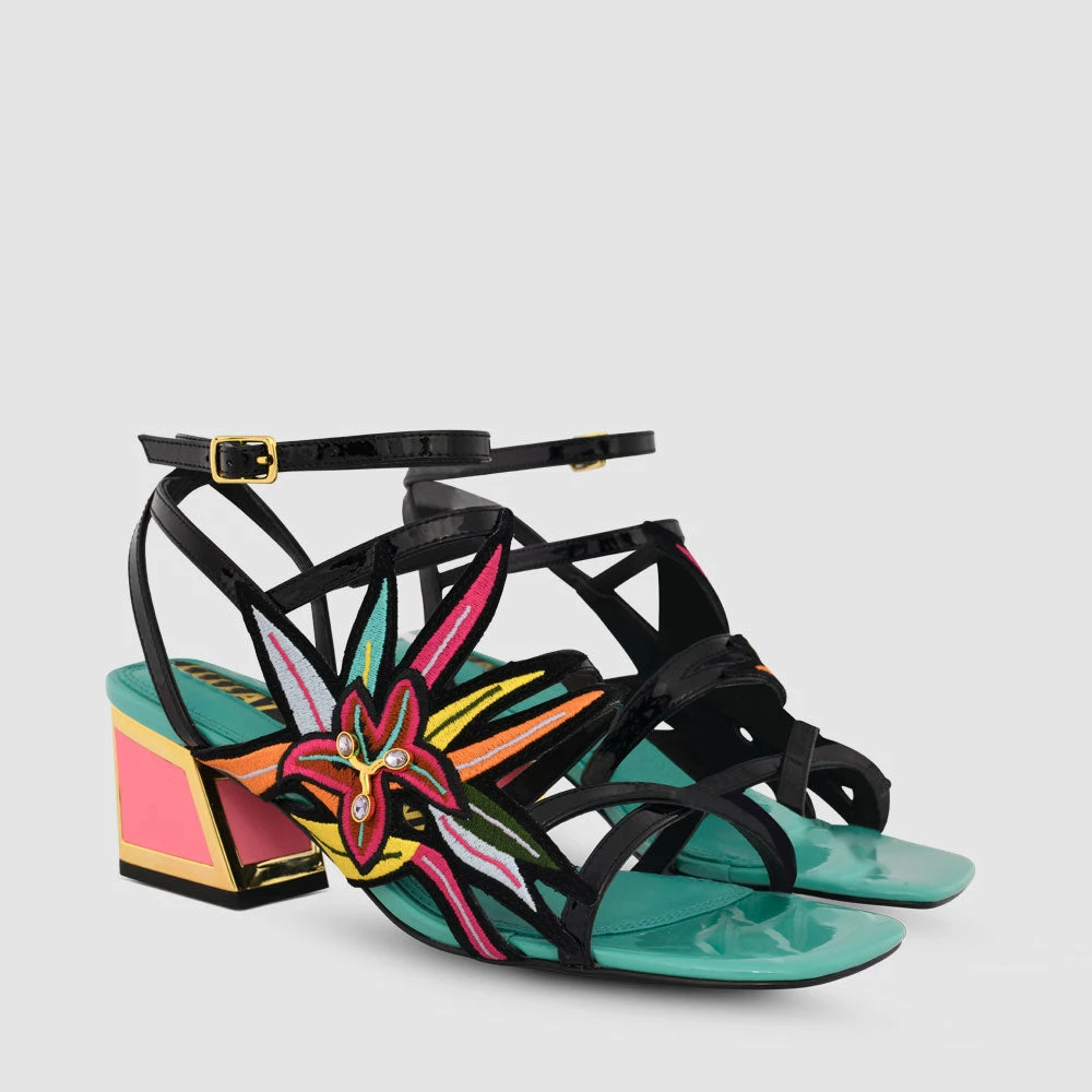 Keep things exotic in the Clemence heel. Crafted from bright leather and embroidered with multi-coloured flowers, this block heel design is the strappy sandal your pedi deserves this summer.