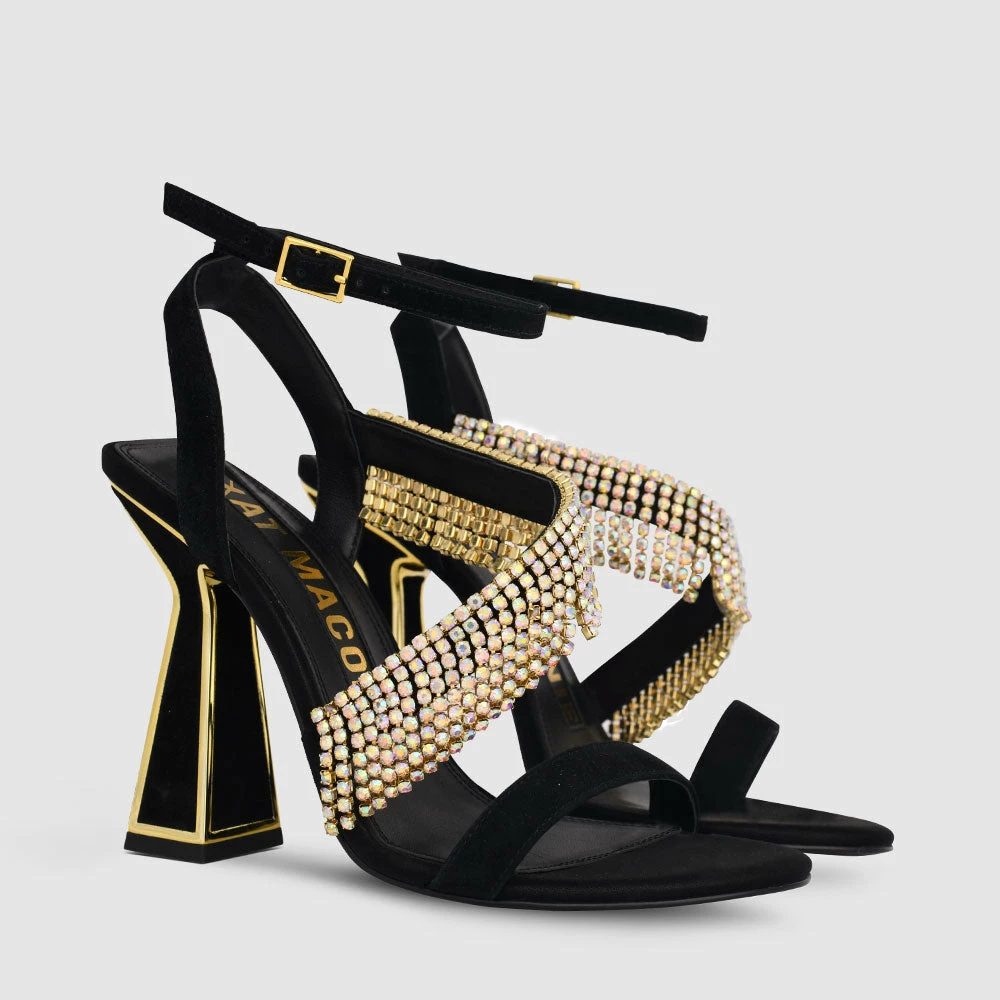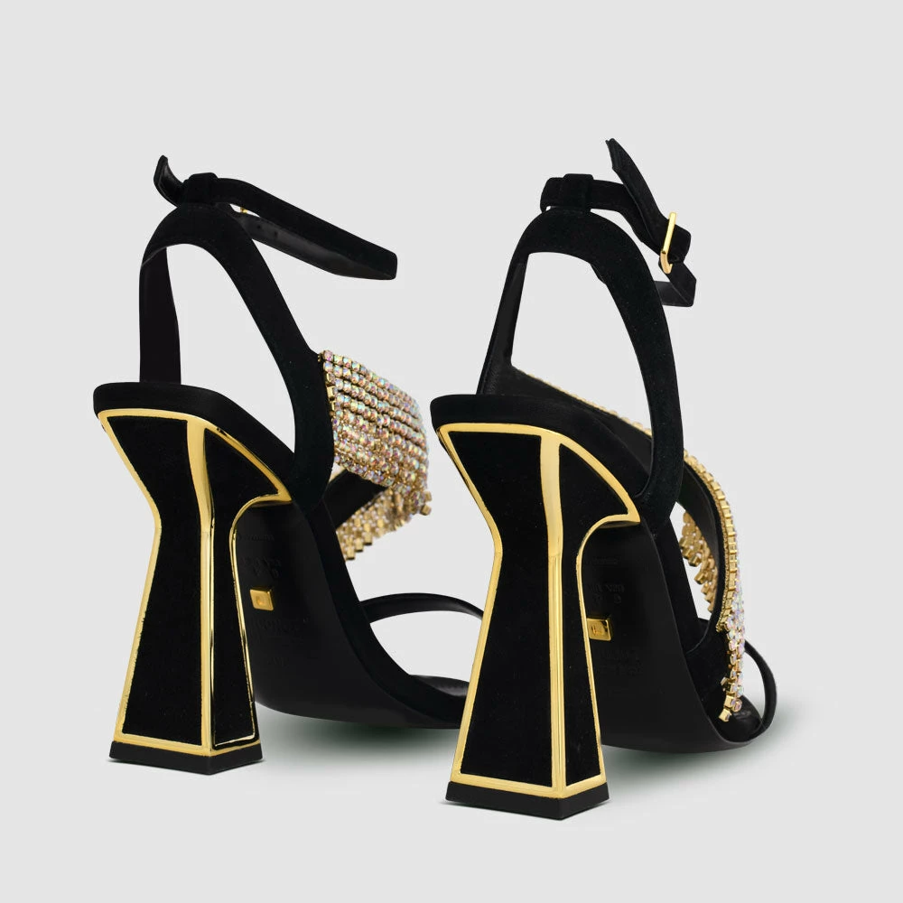 Mila makes a statement all right. This hourglass heeled sandal is crafted from black suede leather, with gold-toned fringe detailing across the strap secured with a buckle to the ankle. A unique high heel with a touch of fun.