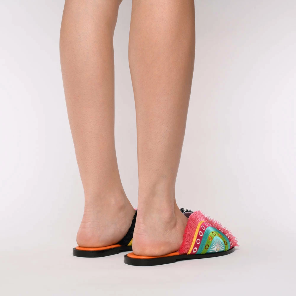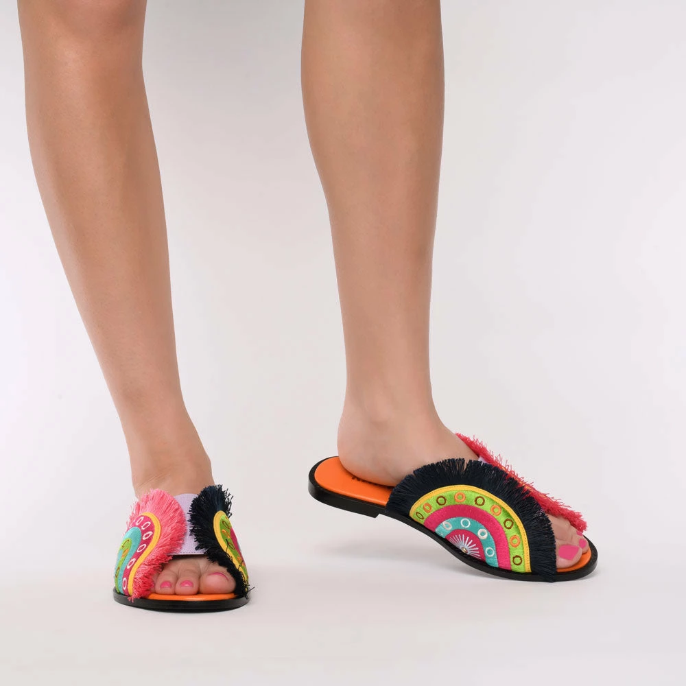 Wave goodbye to mundane, with the Mona sliders. Crafted from orange leather and with embroidred detailing, these are the ultimate way to brighten up everyday admin – with textured, fan-inspired detailing to the side in all the colourful shades to match your own.
