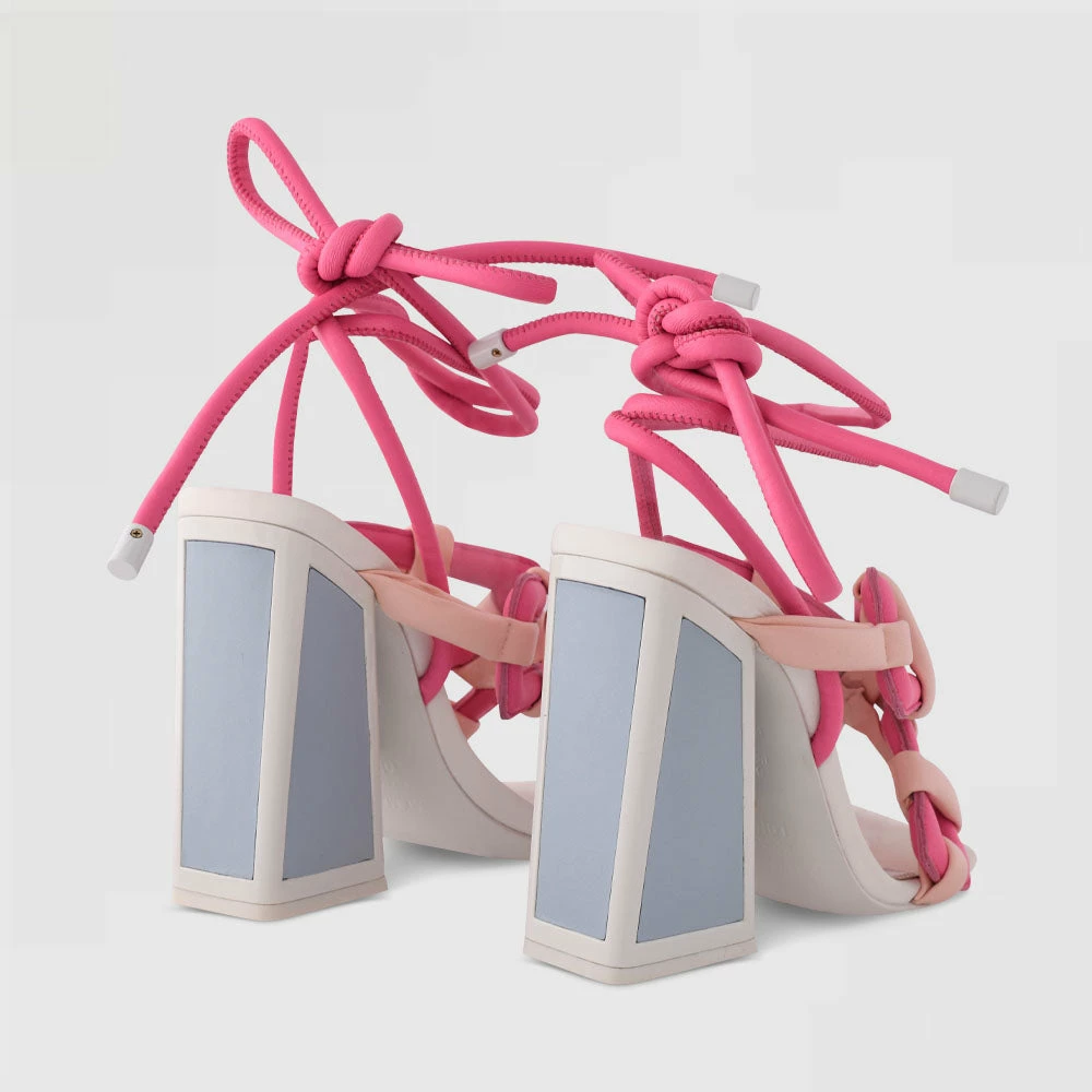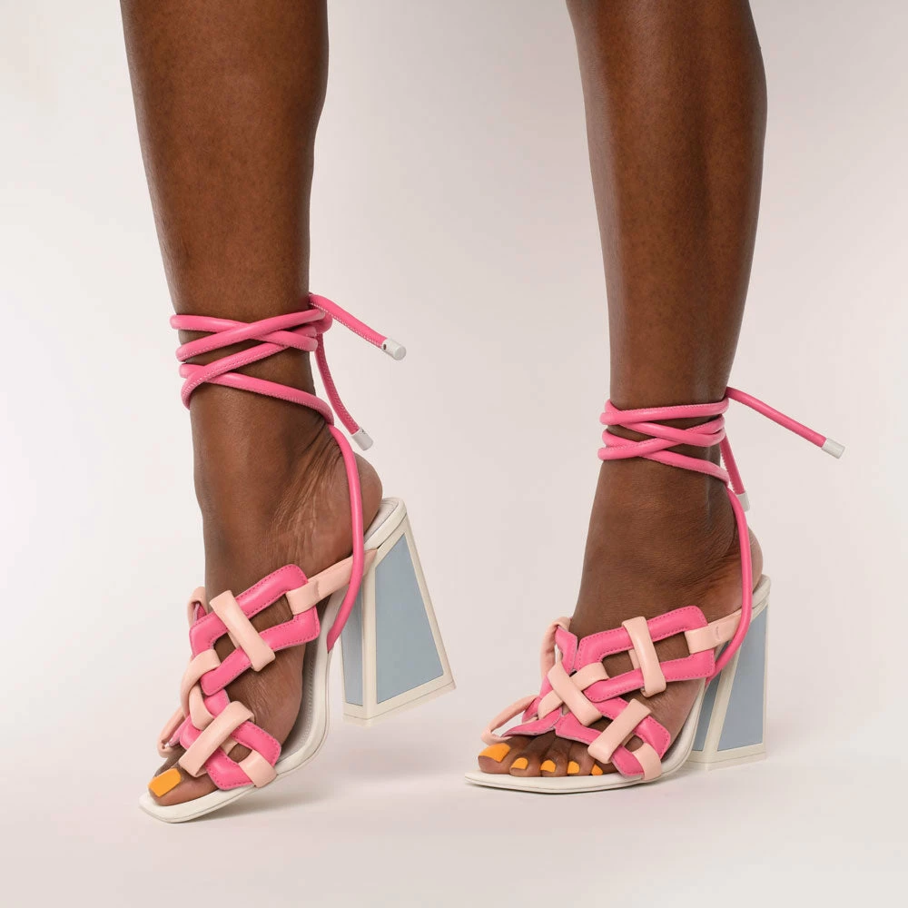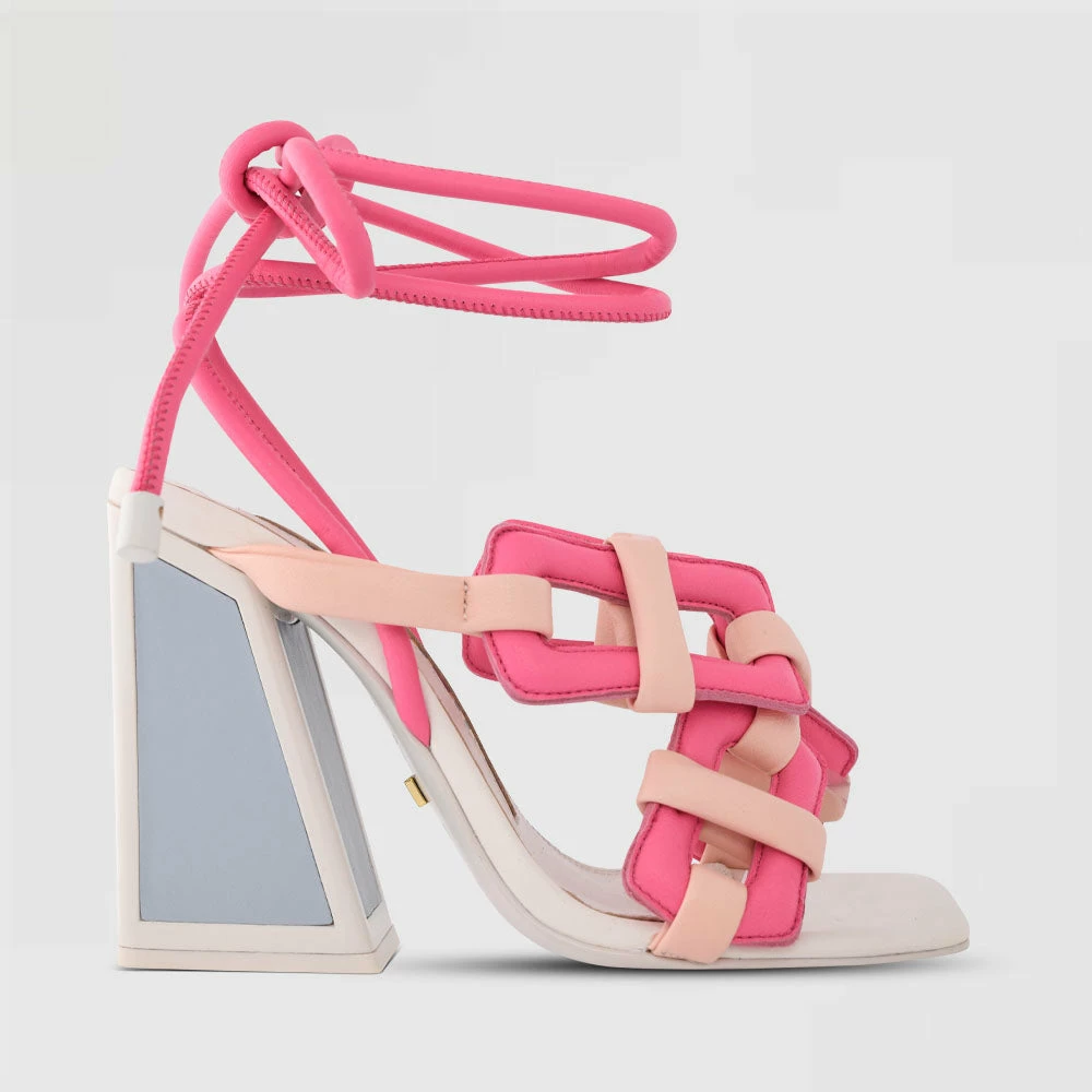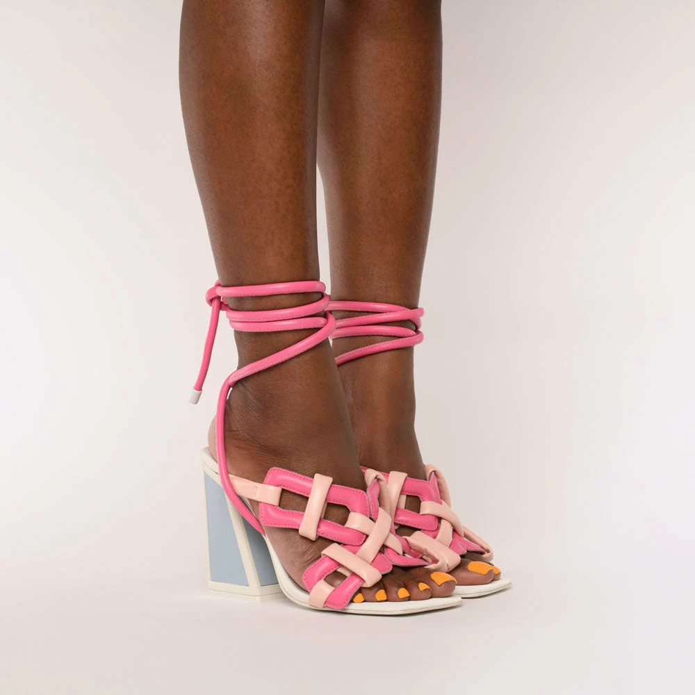 The Monira heel is a sculptural work of art…if do say so ourselves. Chunky buckle-inspired detailing meets a delicate ankle strap in this high heel crafted from pastel and dragonfruit-pink leather.
