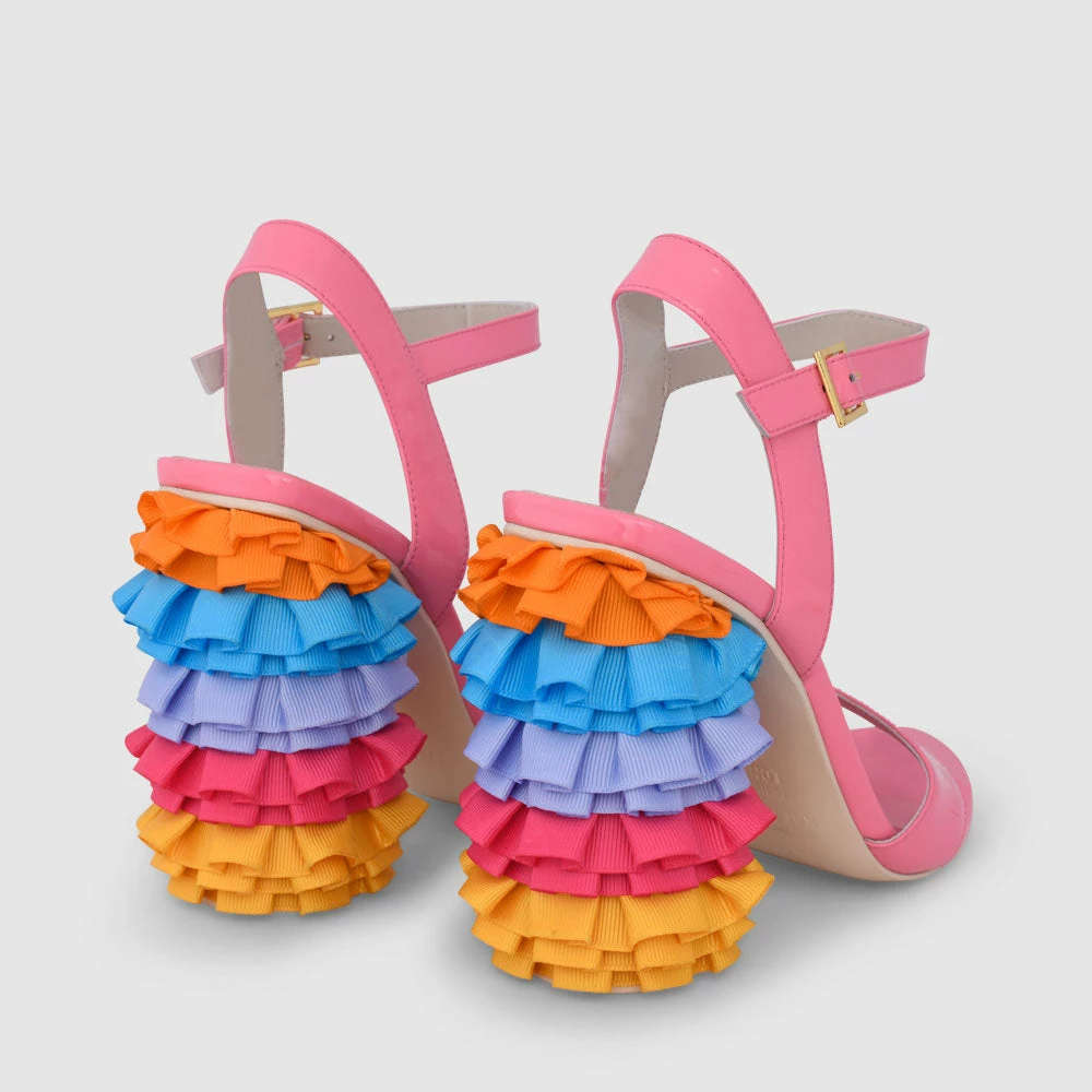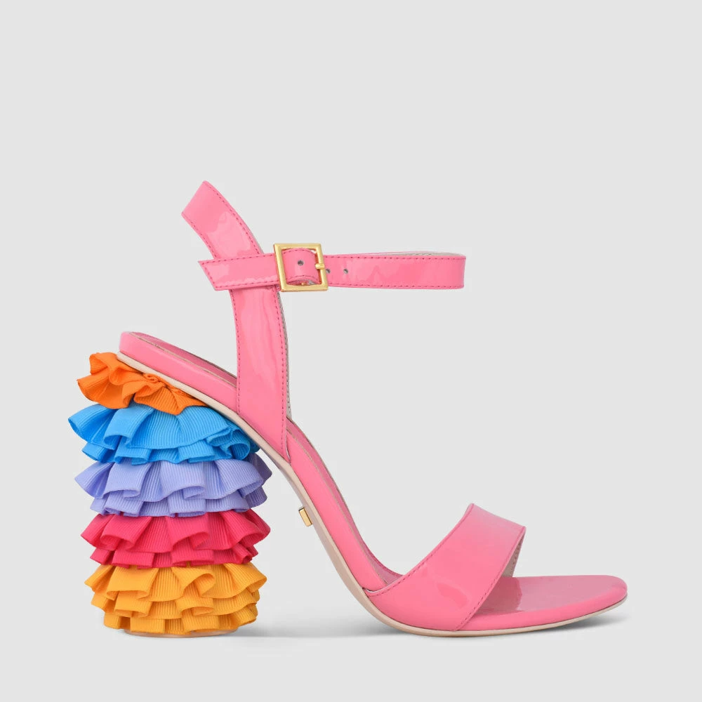 Main character energy— these theatrical Olive high heels are crafted in dragonfruit pink leather, with multi-coloured tulle covering the whole block heel and a delicate ankle strap to contrast.