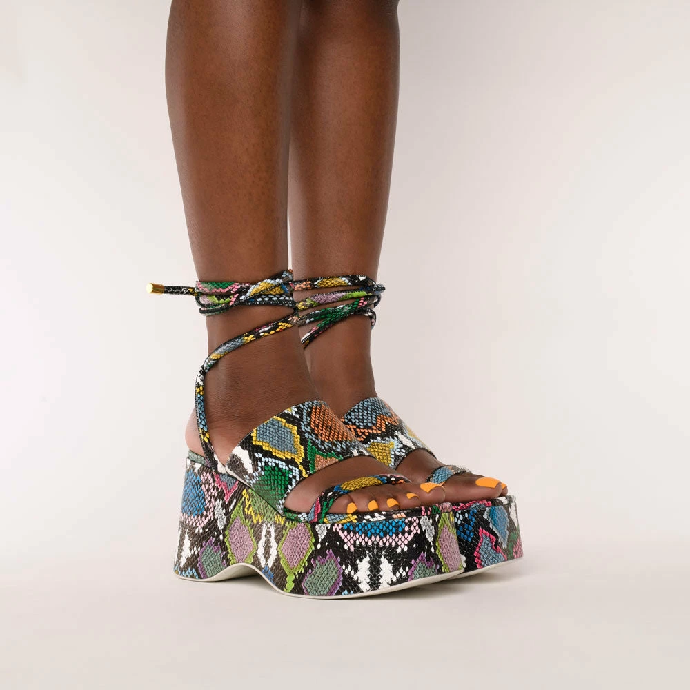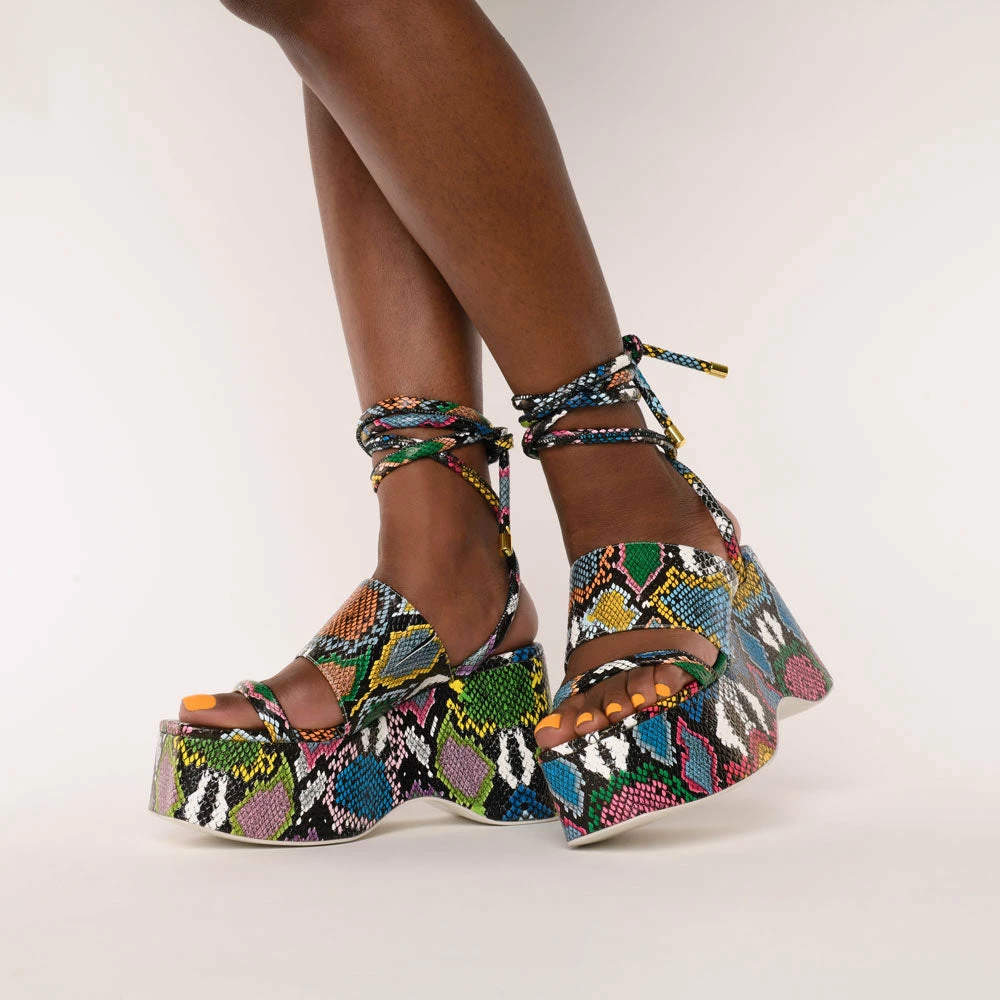 We’ve gone all-out 90s with the Olbi ultra-chunky wedge. A heel made from a multi-coloured, snake print faux leather, it has a strappy tie to the ankle and curved sole nostalgia, is that you?!