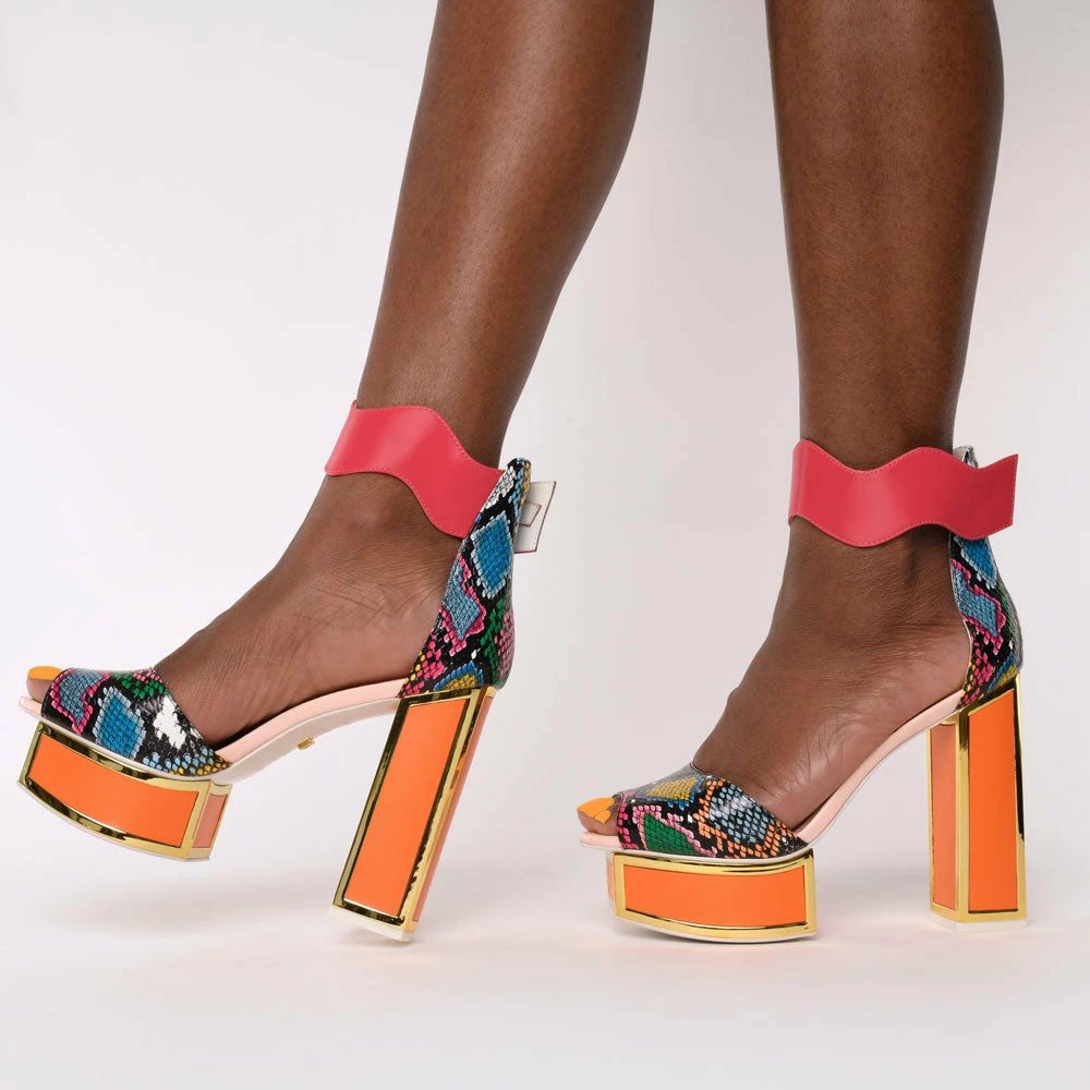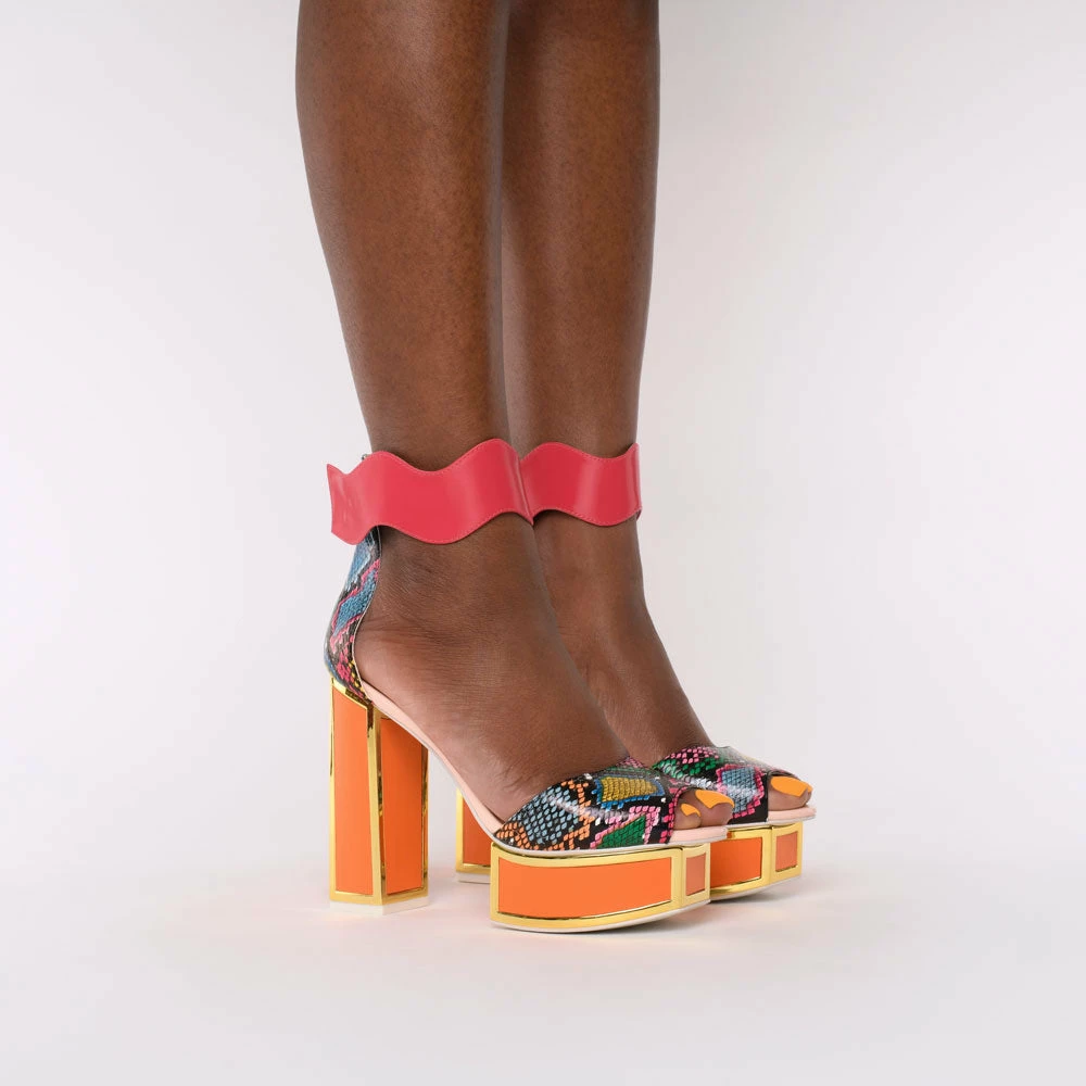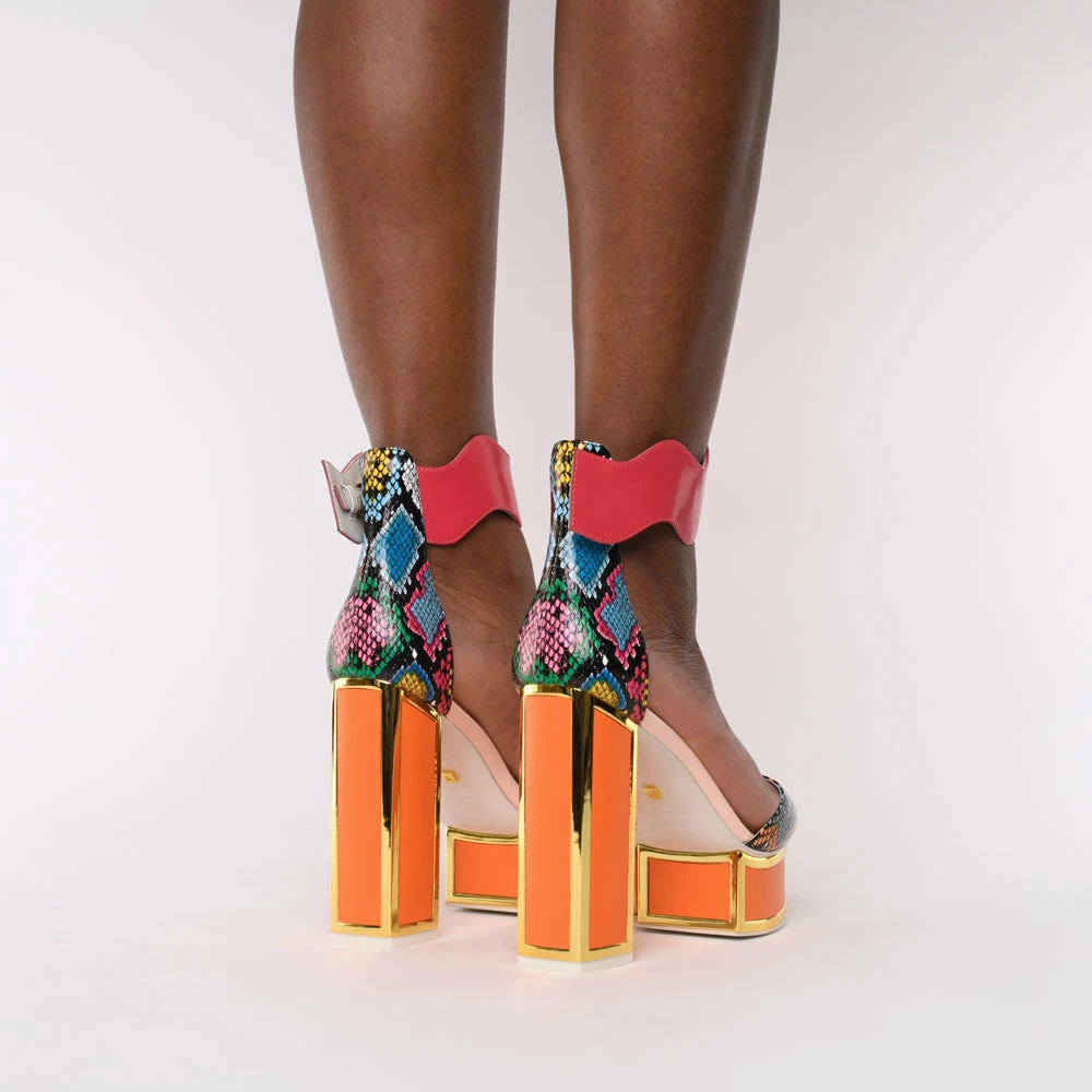A platform that will keep you on your feet, the Pammy heel gives you instant height. Updated for SS’22, in multi colur snake print with contrasting a orange heel and waved ankle strap. Staycation or vacation, you’ll pack these before you even think about clothes.