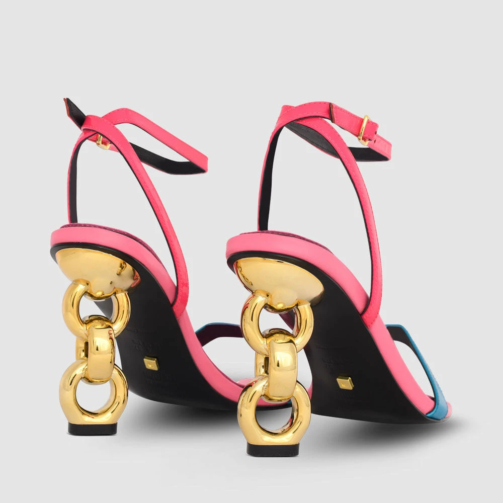 Meet Riri, an even sexier take on our now-iconic chain heels. This sandal is cut from iridescent aqua and dragonfruit pink patent leather, with a strappy design that feels perfectly Y2K.
