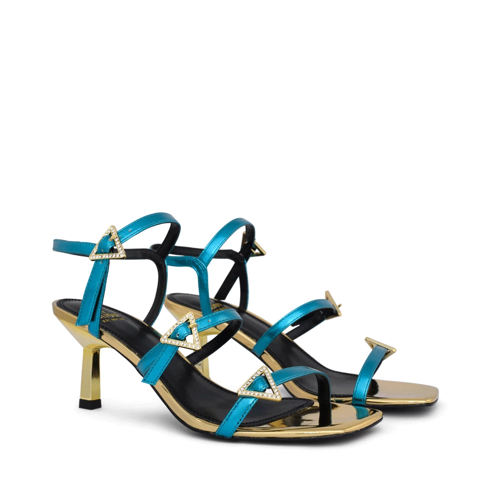 These metallic teal three strap sandals with a slim ankle strap, modern inverted kitten heel and chevron buckle details will complete any look. Perfect for a destination wedding or any occasion where elegance is essential.