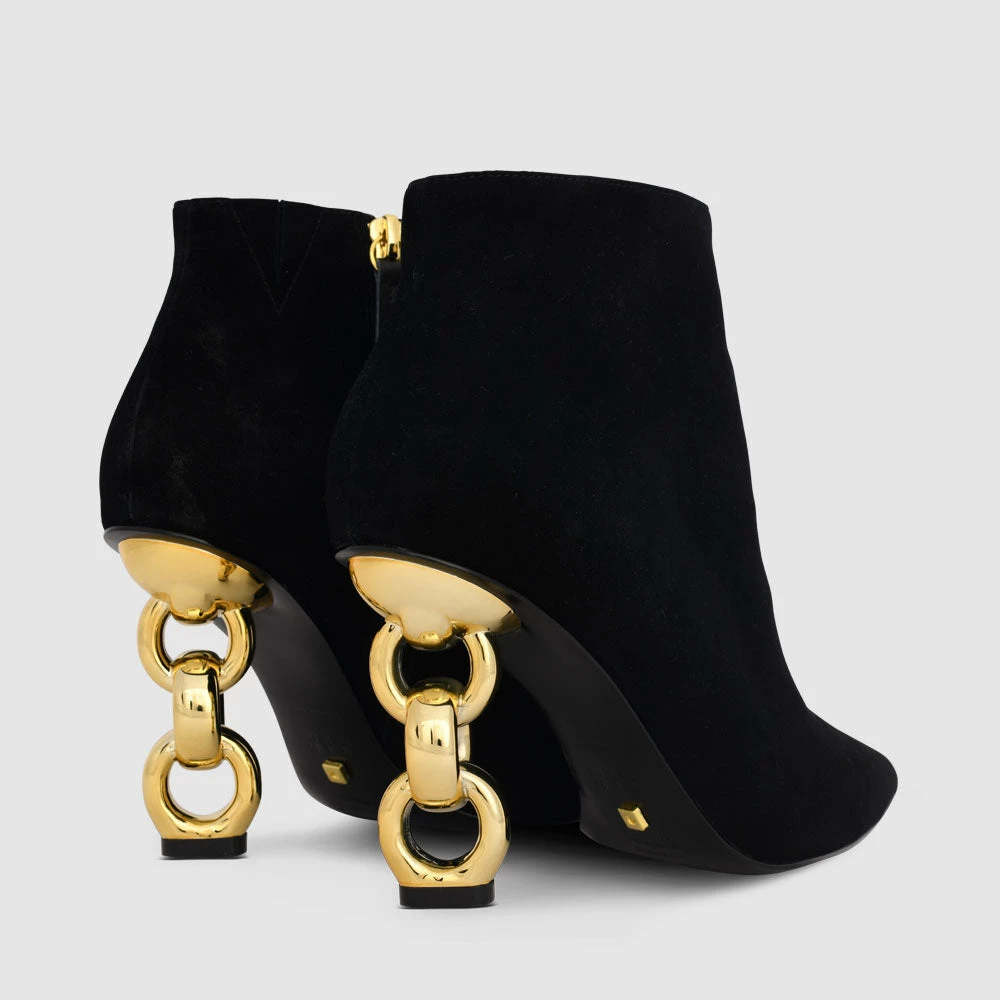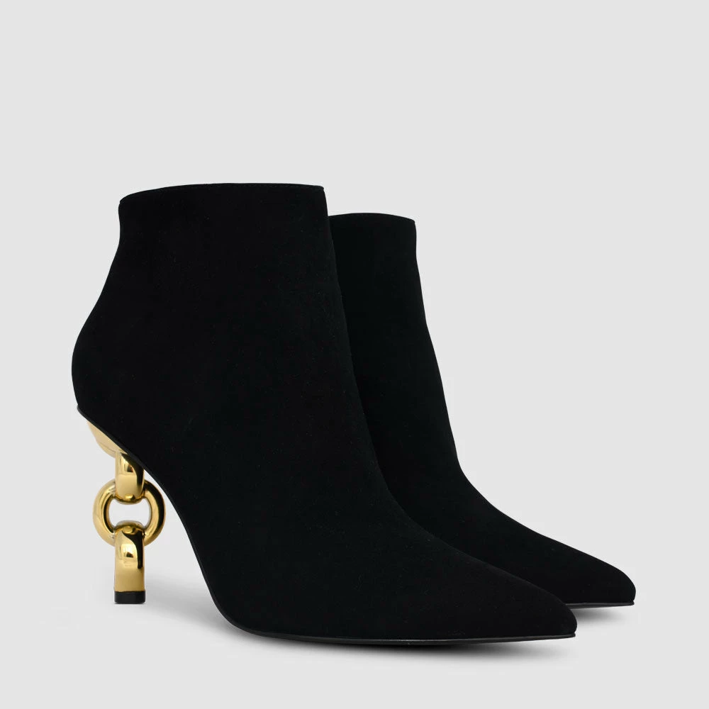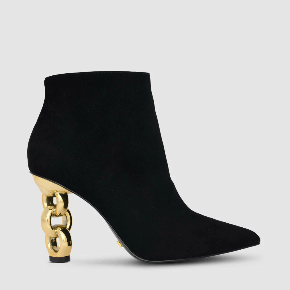 The Toni is your go-to ankle boot, but sexier. This style crafted from black suede leather is set on our new-in chain heel, with a zip-side fastening and pointed toe. Team with denim, wear with dresses—all winter long.
